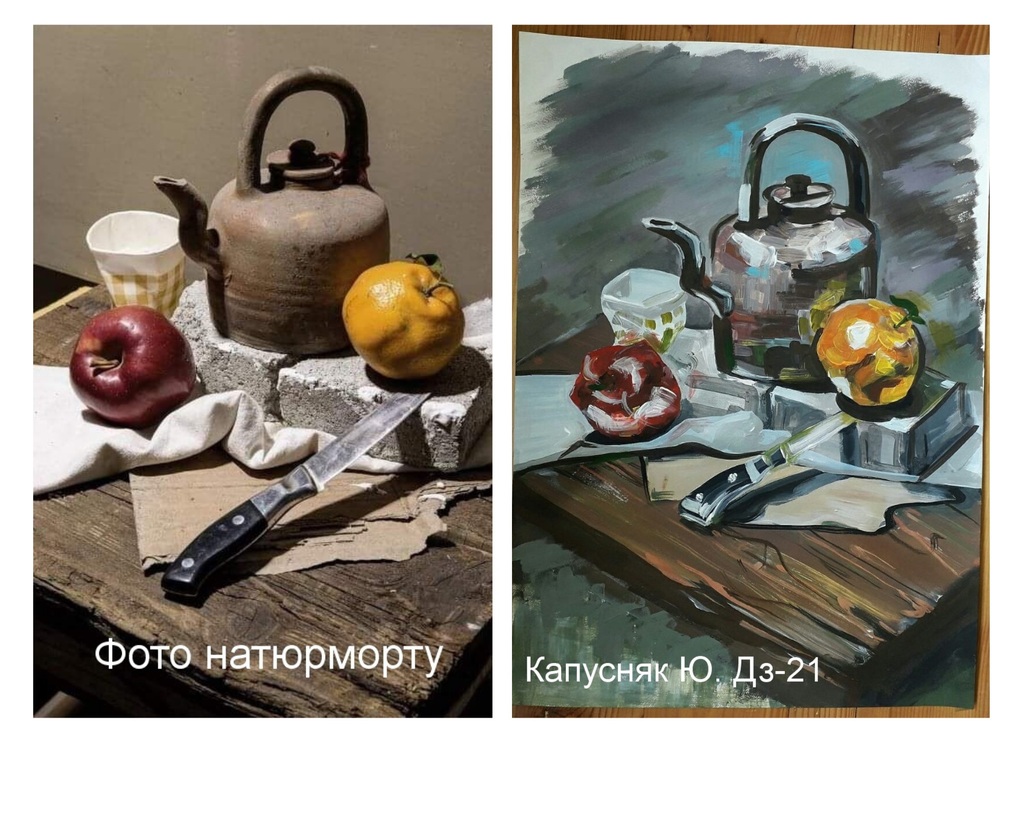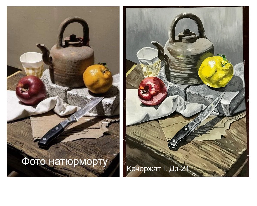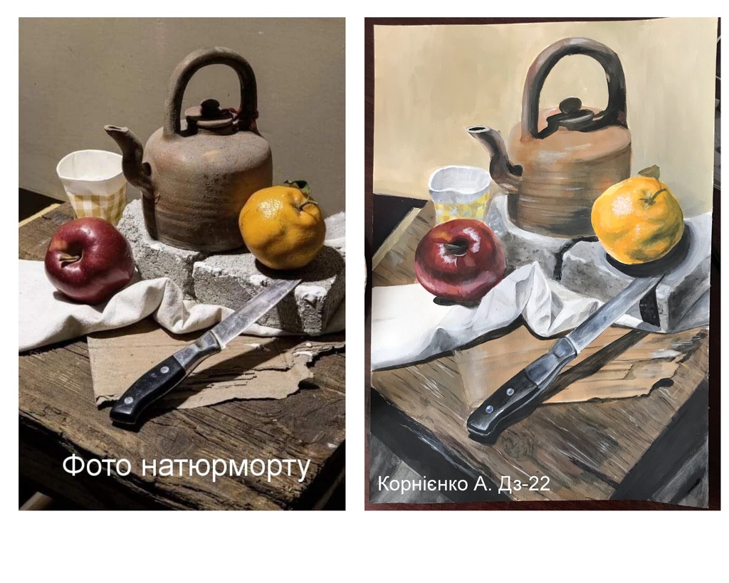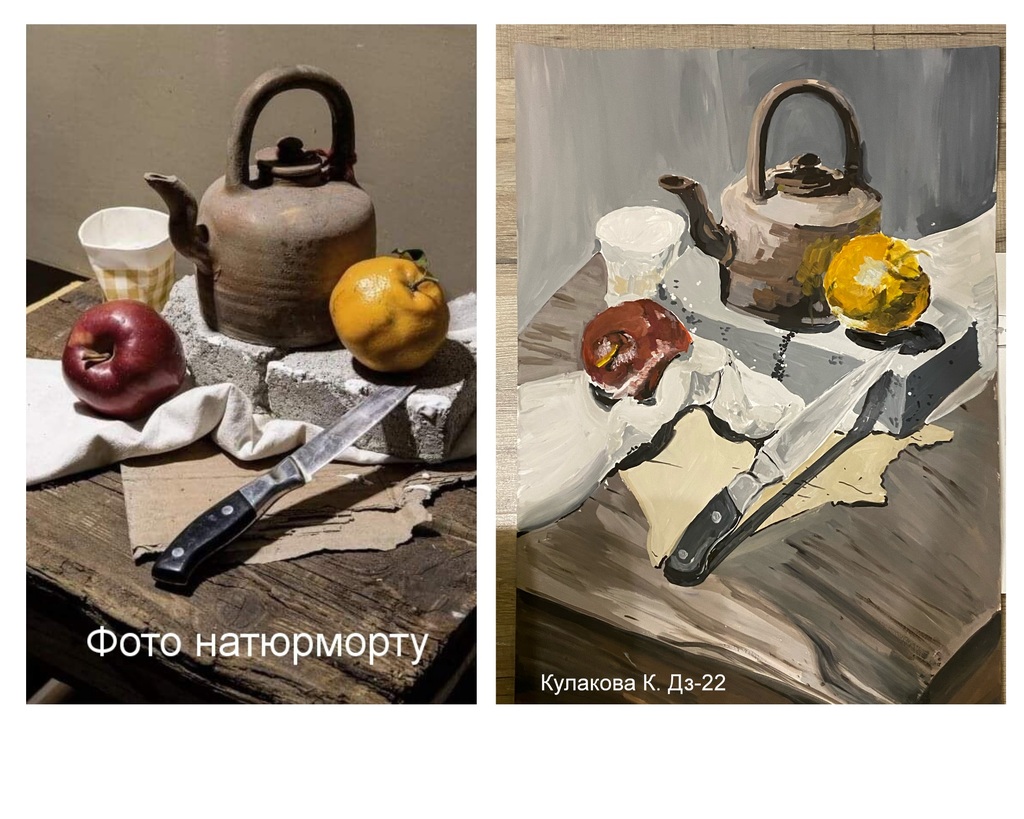 Ми підібрали кращі фото виконаних контрольних завдань. Зліва фото натюрморту, справа – виконане завдання.