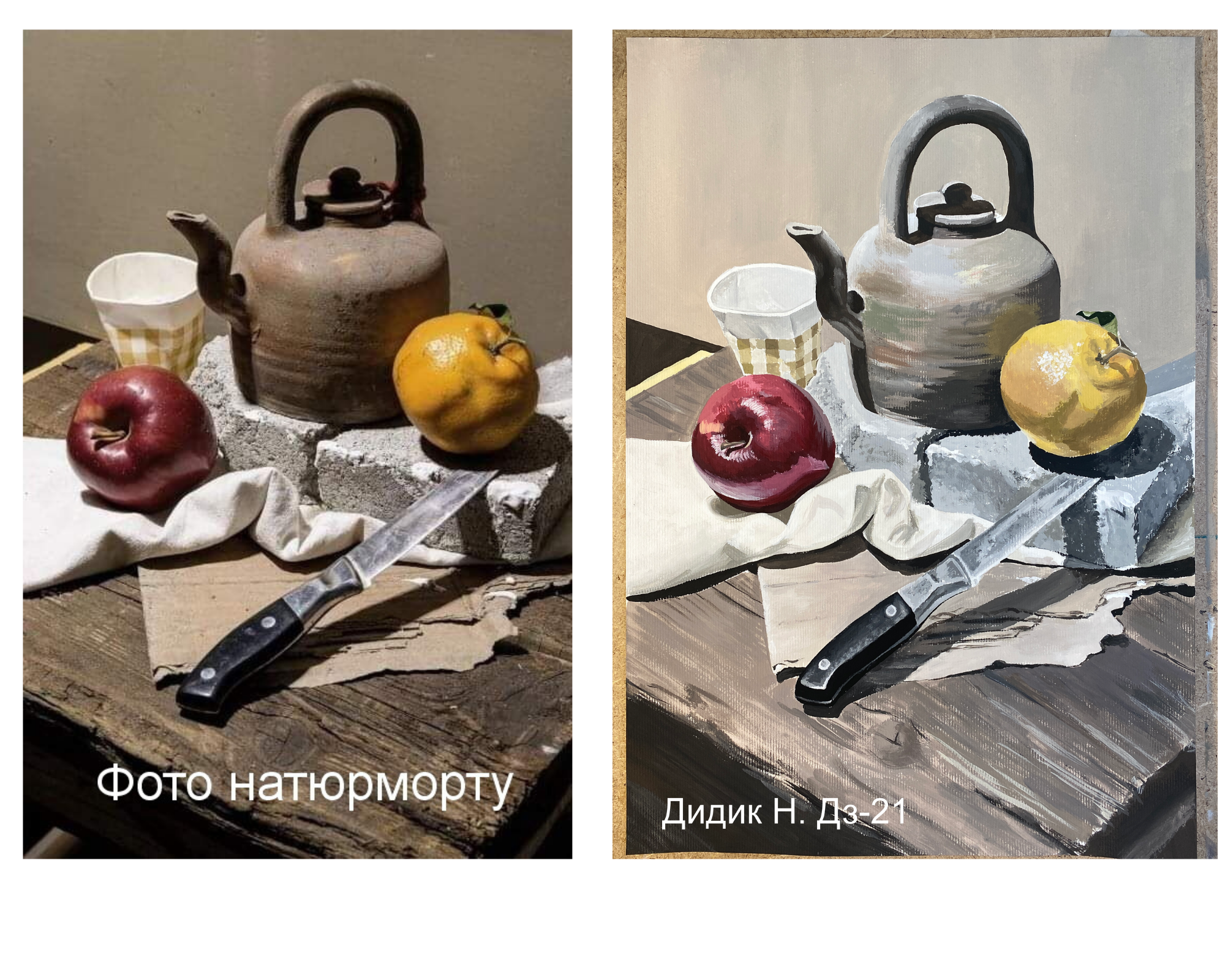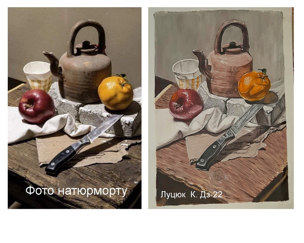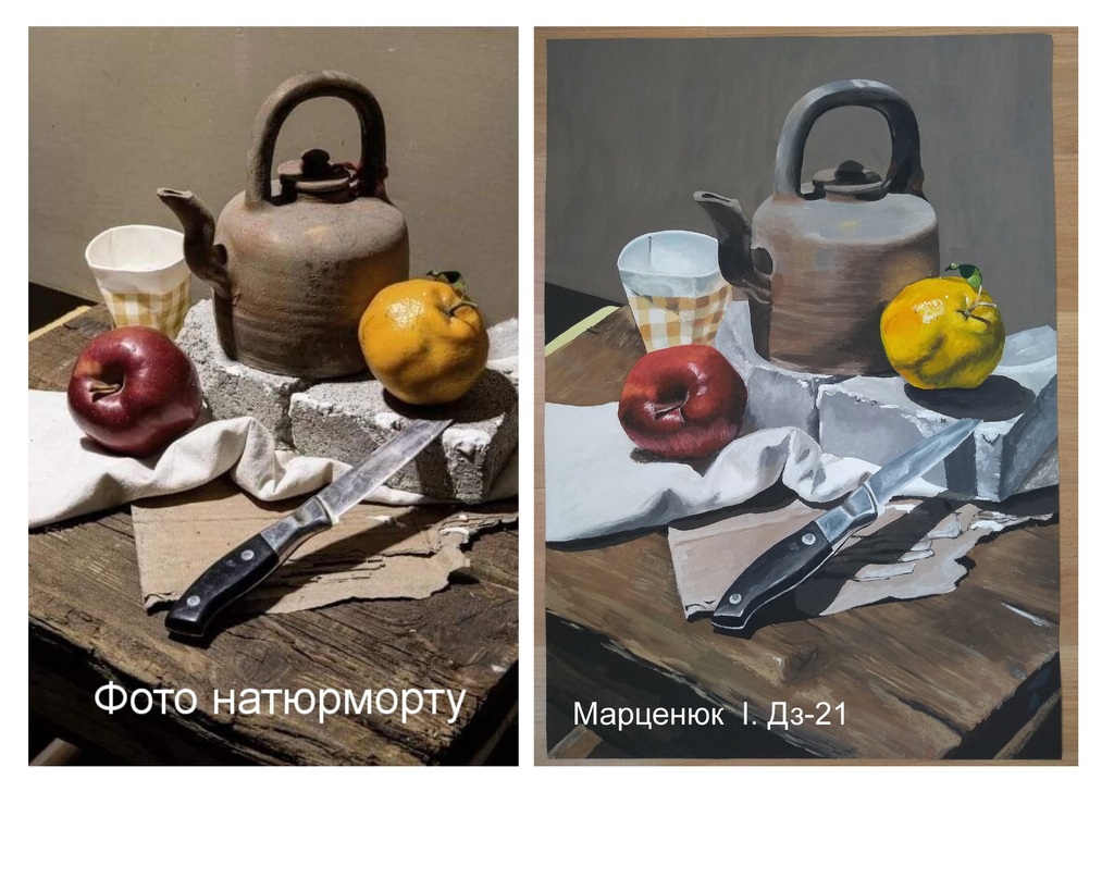 Ми підібрали кращі фото виконаних контрольних завдань. Зліва фото натюрморту, справа – виконане завдання.