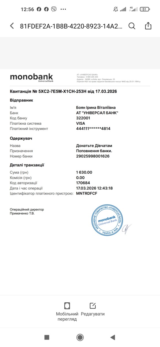 Завдяки спільним зусиллям вдалося зібрати 1630 грн, які передано Оксані Рубаняк на збір «Донатьте Дівчатам» для потреб ЗСУ.